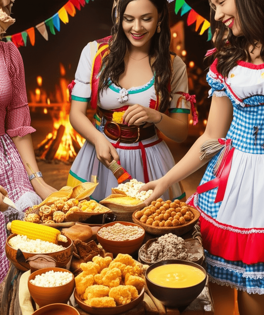 As comidas tradicionais incluem milho, pamonha, canjica, pipoca, e doces como paçoca e cocada.