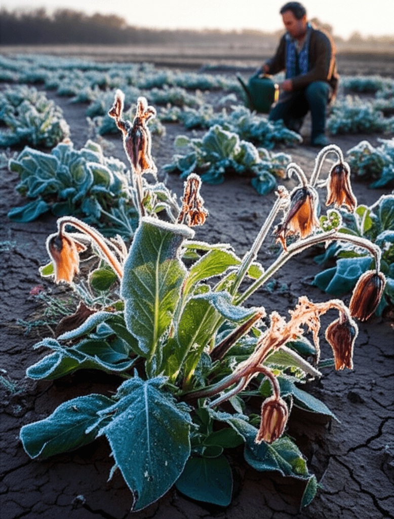 A água dentro das células das plantas congela, rompe as paredes celulares e destrói os tecidos. Isso prejudica o crescimento e a colheita.